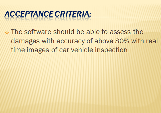 The software should be able to assess the damages with accuracy of above 80% with real time images of car vehicle inspection.
